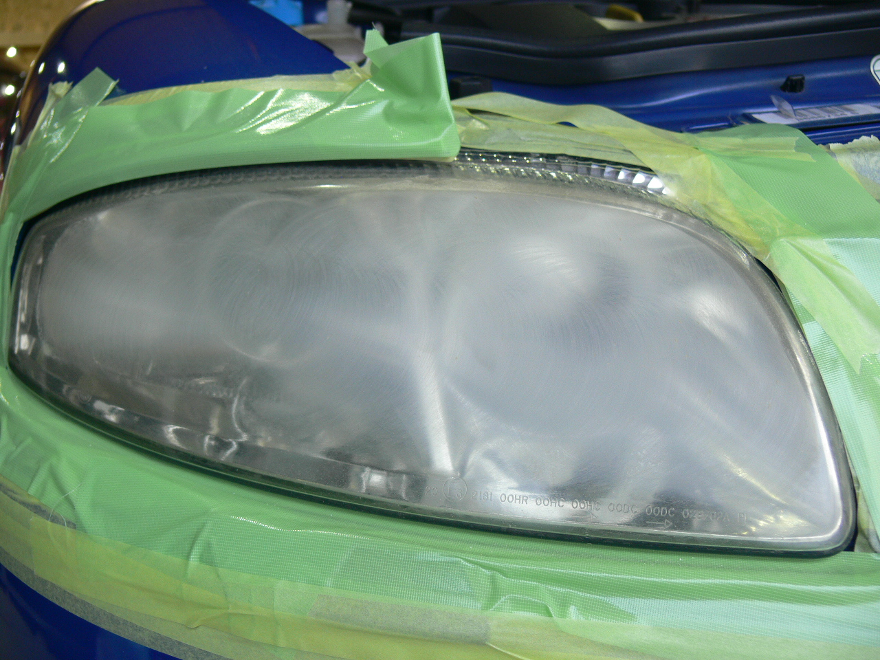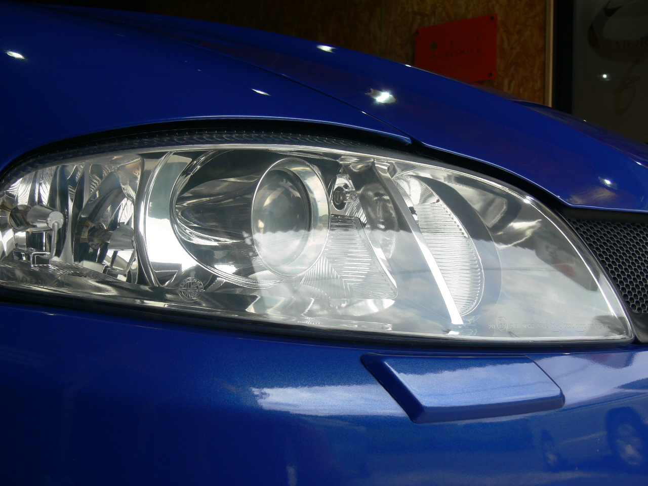 アルファロメオのヘッドライトリペア。黄色く変色してしまった表面コートを除去してPROTECTIONFILMを施工。